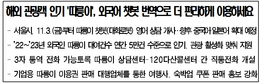 서울시가 2023년 11월 3일부터 서울을 방문하는 외국인 관광객들이 좀 더 편리하게 따릉이를 이용할 수 있도록 챗봇(대화로봇)을 통하여 영어로 상담을 지원하고 다산콜센터와 따릉이 상담센터 간 직통전화를 개설하여 3자 통역을 제공한다고 합니다.