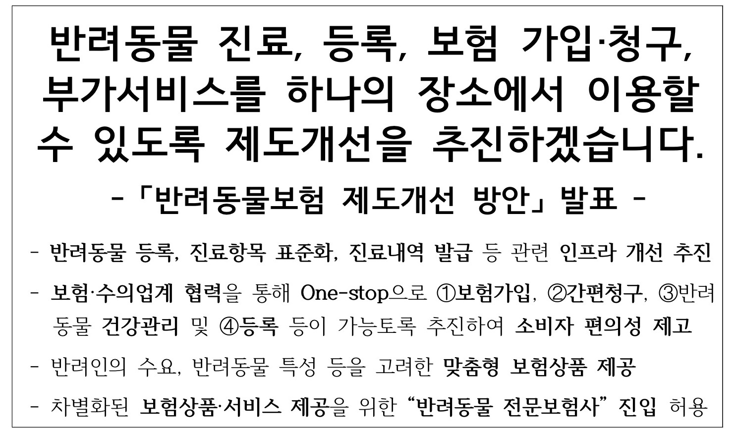 [4]반려동물보험 관련 전문성을 기반으로 한 신규 플레이어들이 차별화된 다양한 보험 관련 상품·서비스를 제공할 수 있도록, “반려동물 전문보험사” 진입을 허용해 나갈 계획(2023.下~)