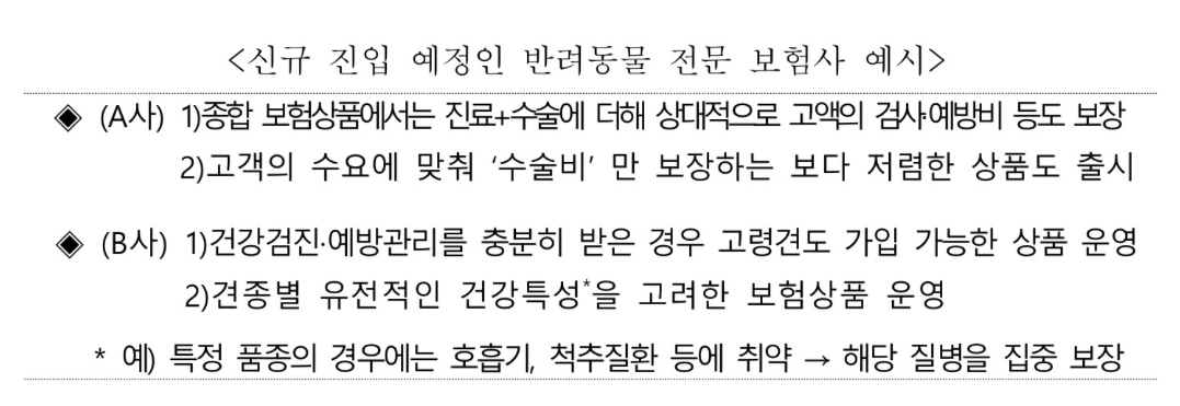 ② (신규 상품 개발) 관련 인프라 구축 상황 등을 보아가며 과잉진료 방지장치 마련 등을 전제로 저렴한 보험료로 이용가능한 신규 반려동물보험 상품 개발* 등도 검토해 나갈 예정