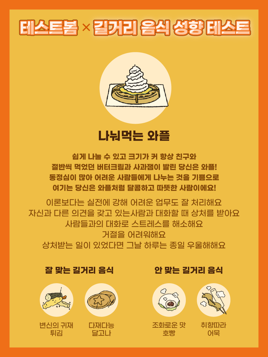 동정심이 많아 어려운 사람들에게 나누는 것을 기쁨으로 여기는 당신은 와플처럼 달콤하고 따뜻한 사람이에요!