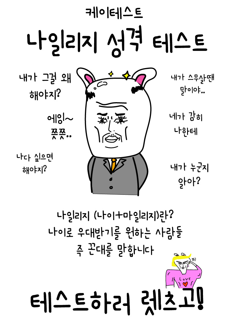 케이테스트라는 다양한 재밌는 테스트를 만드는 사이트에서 나일리지 성격 테스트라고 새로 나왔는데 나일리지란 나이+마일리지를 말하며 나이로 우대받기를 원하는 사람들 즉 꼰대를 말한다고 합니다.