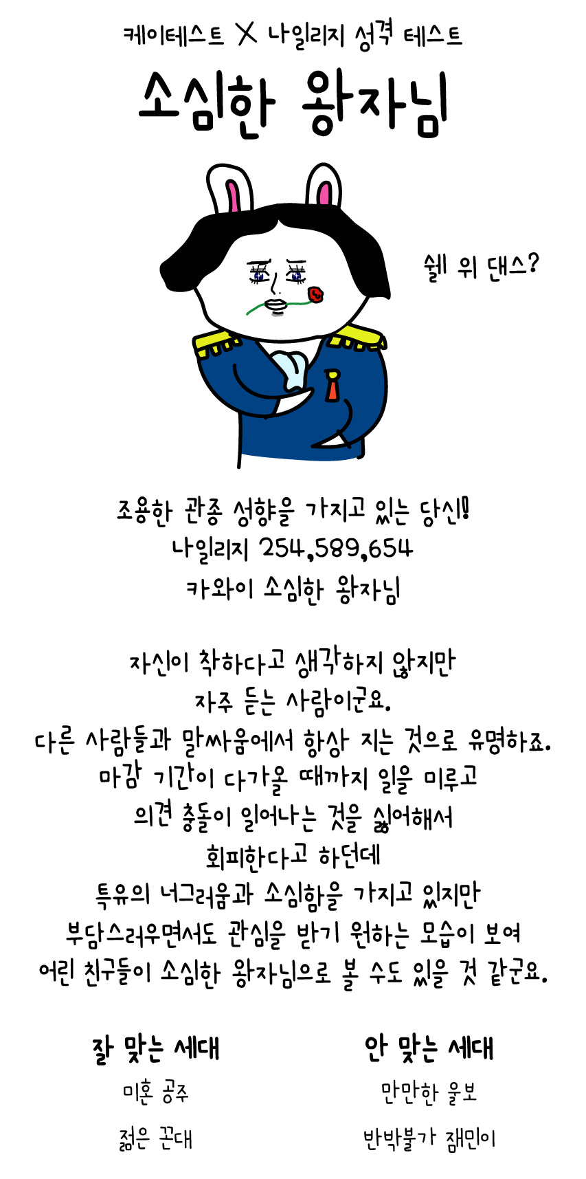 특유의 너그러움과 소심함을 가지고 있지만 부담스러우면서도 관심을 받기 원하는 모습이 보여 어린 친구들이 소심한 왕자님으로 볼 수도 있을 것 같군요.