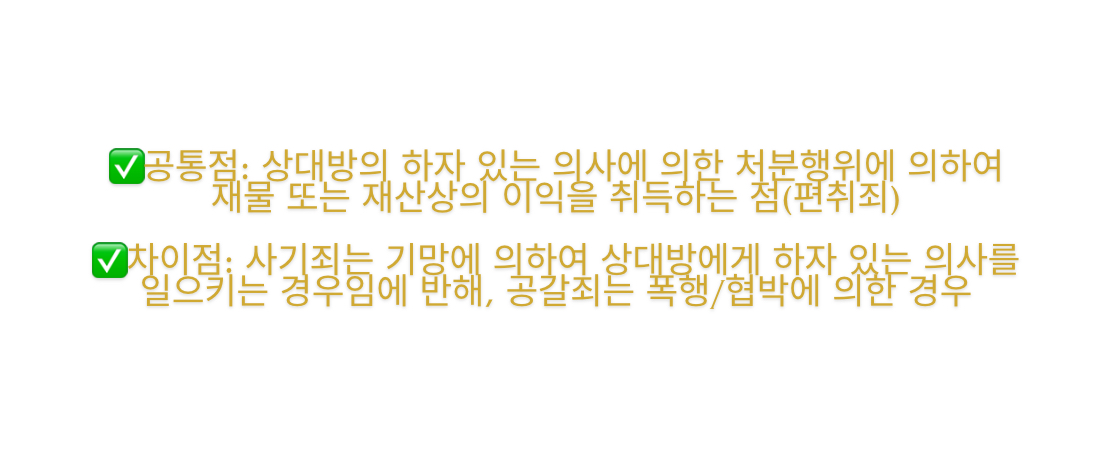 ✅차이점: 사기죄는 기망에 의하여 상대방에게 하자 있는 의사를 일으키는 경우임에 반해, 공갈죄는 폭행/협박에 의한 경우