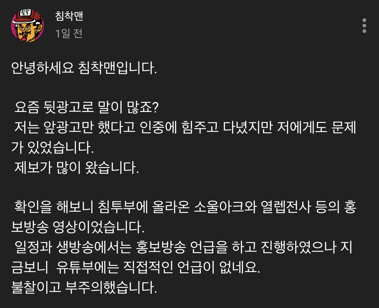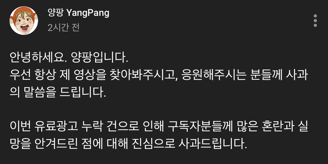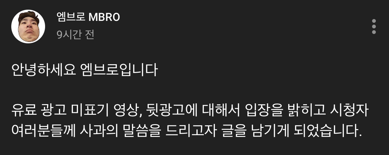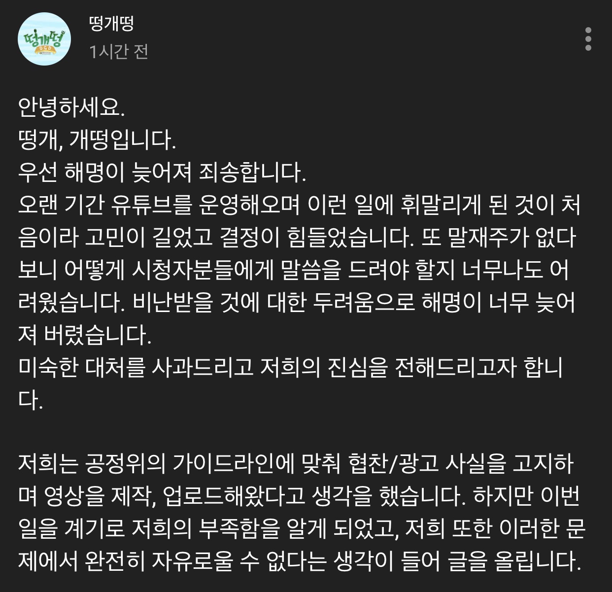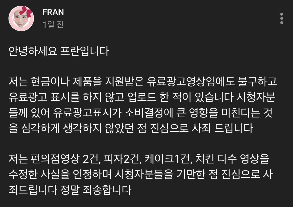 "유료 광고 미표기 영상, 뒷광고에 대해서 입장을 밝히고 시청자 여러분들께 사과의 말씀을 드리고자 글을 남긴다"