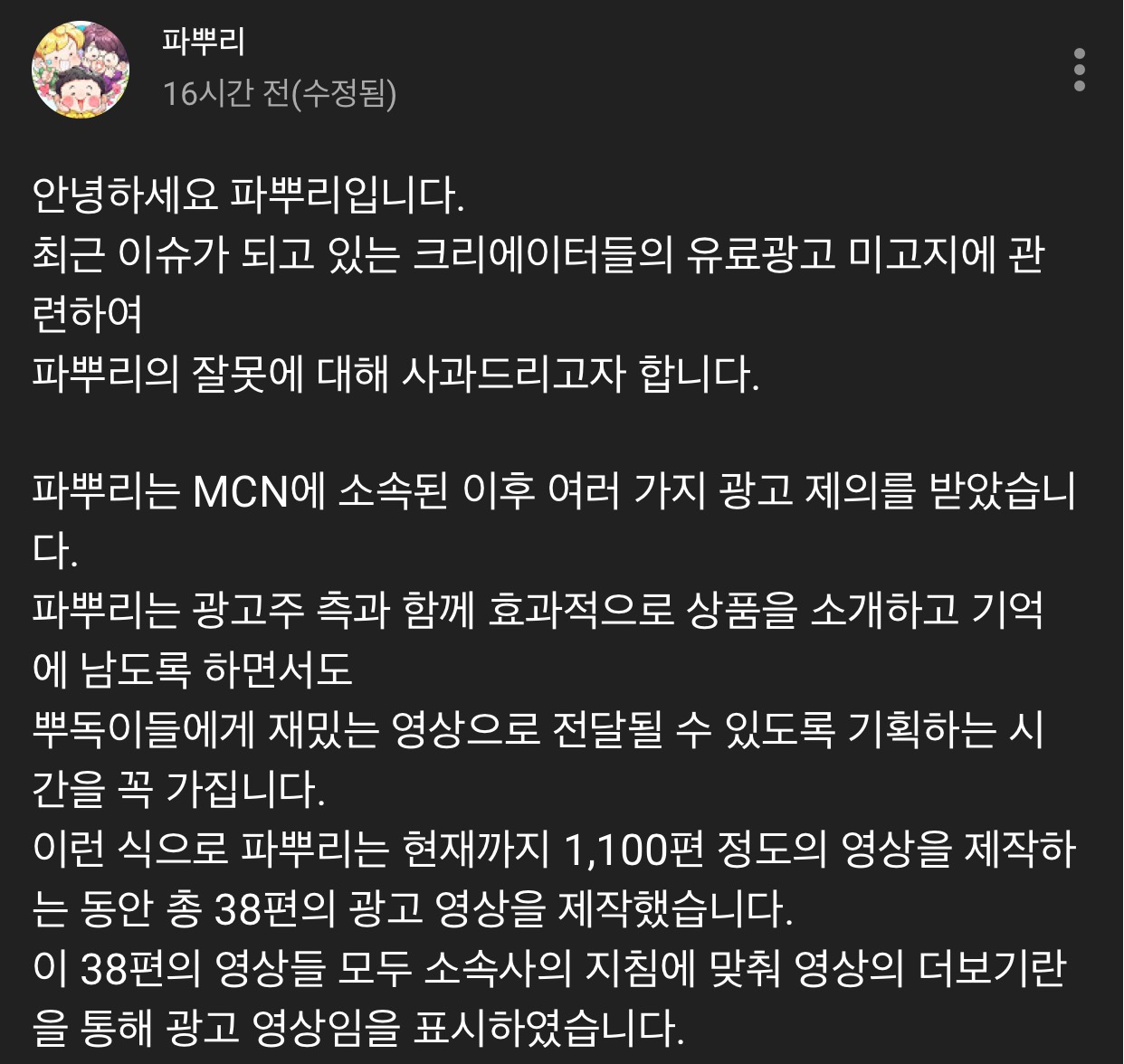 "표기 못 한 몇몇 영상들에 대해 유료광고표기를 급히 수정하고 광고영상을 광고영상이라 명확히 고지하지 못했다. 저로 인해 불편해하시고 실망하신 시청자분들께 정말 죄송하다"라고 전했다.
