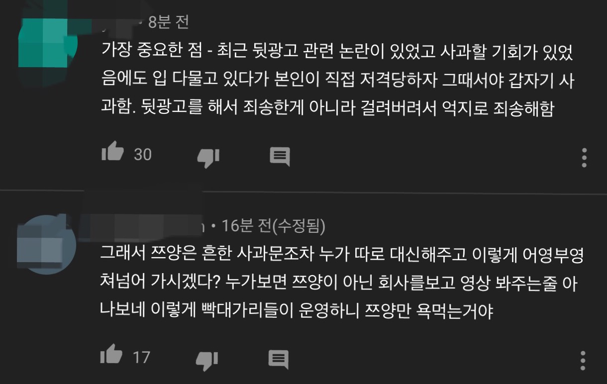 진정성을 어필하는 유튜버들의 행태에 구역질이 날 정도”라며 뒷광고 논란에 대처하는 유튜버들의 행동에 회의감을 느꼈다고 폭로