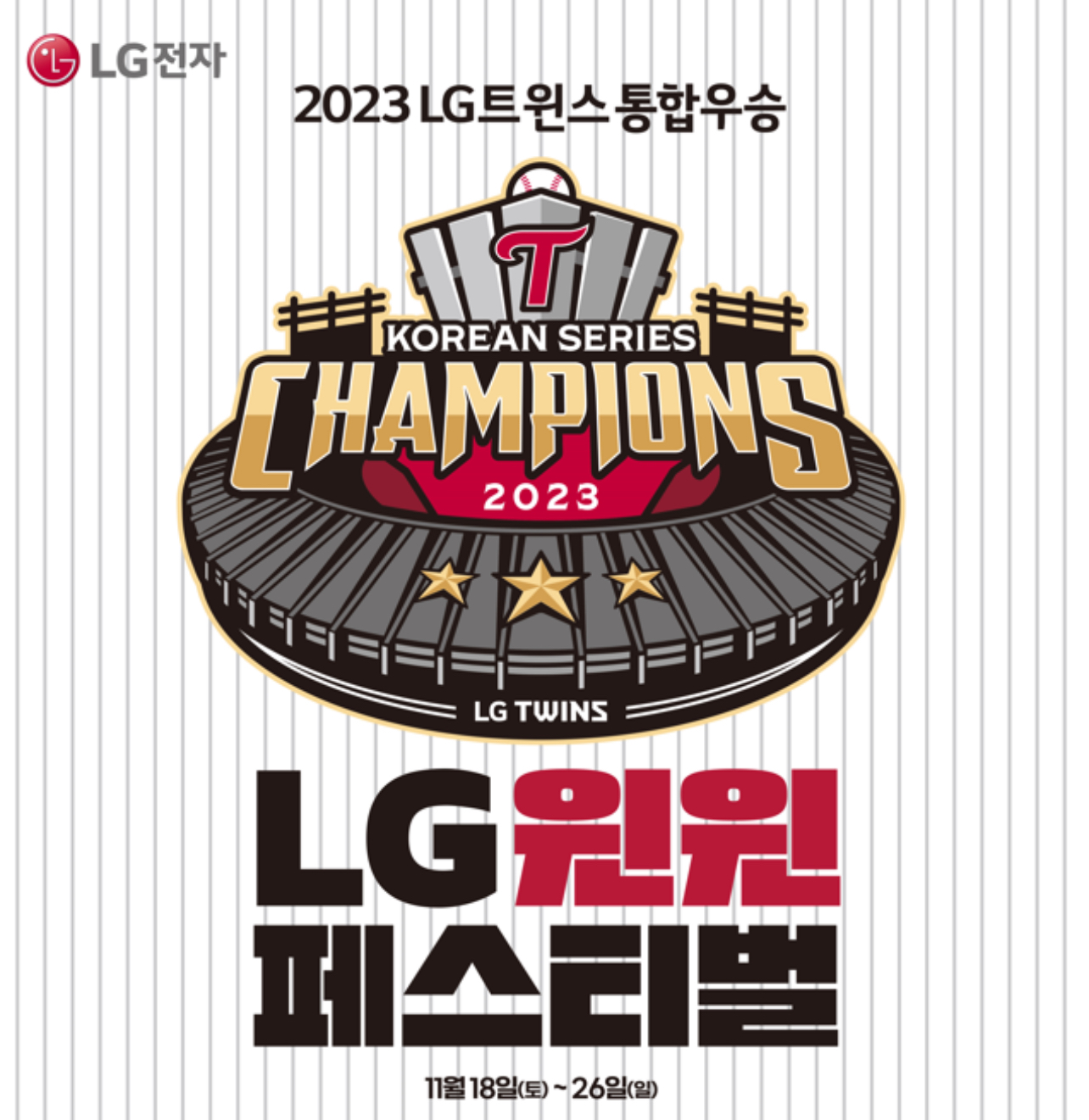 2023년 11월 16일 LG전자는 29년 만의 LG트윈스 한국시리즈 우승을 기념해 가전제품 할인 및 경품 이벤트 'LG 윈윈 페스티벌'을 진행한다고 밝혔습니다.