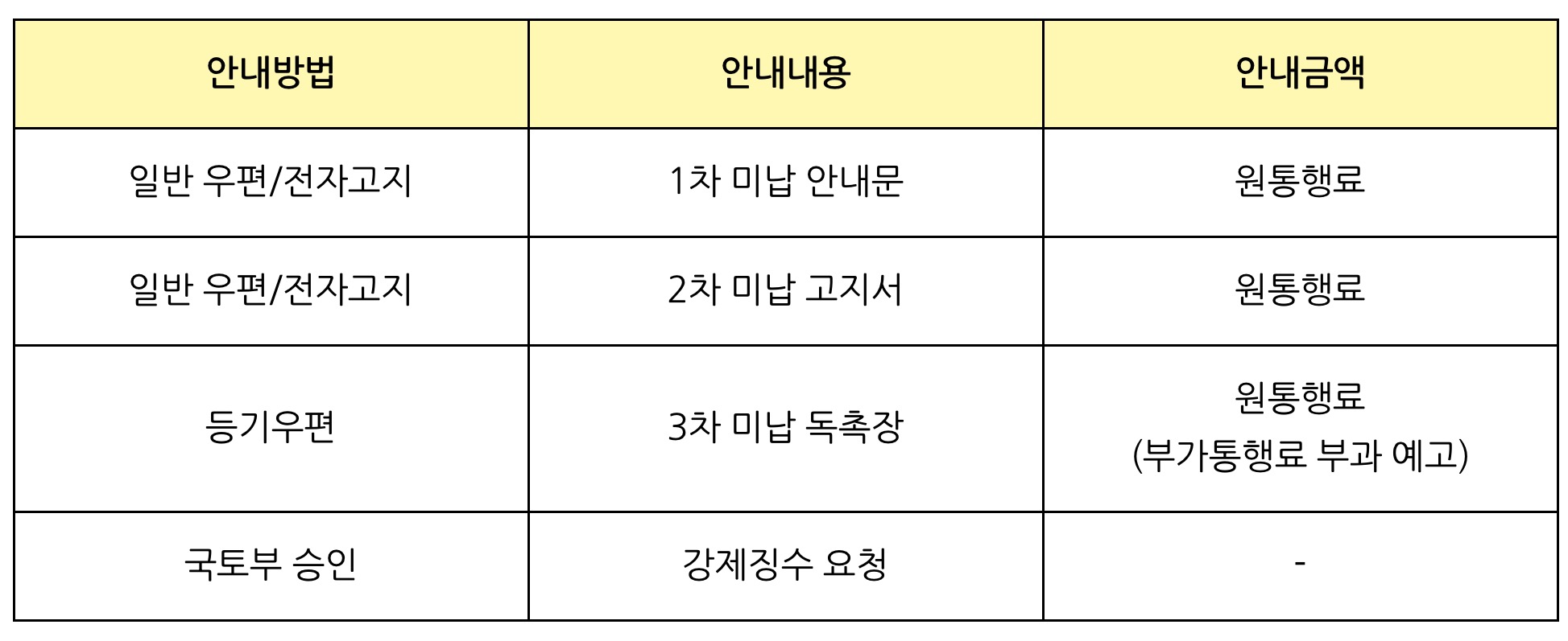 톨게이트 미납 금액은 일반 우편 또는 전자고지를 통해 운전자에게 전달되며 1차 미납 안내문 > 2차 미납 고지서 > 3차 미납 독촉장 이후에도 미납된다면 국토부 승인에 따라 강제징수가 진행된다는 점 유의하시길 바랍니다.