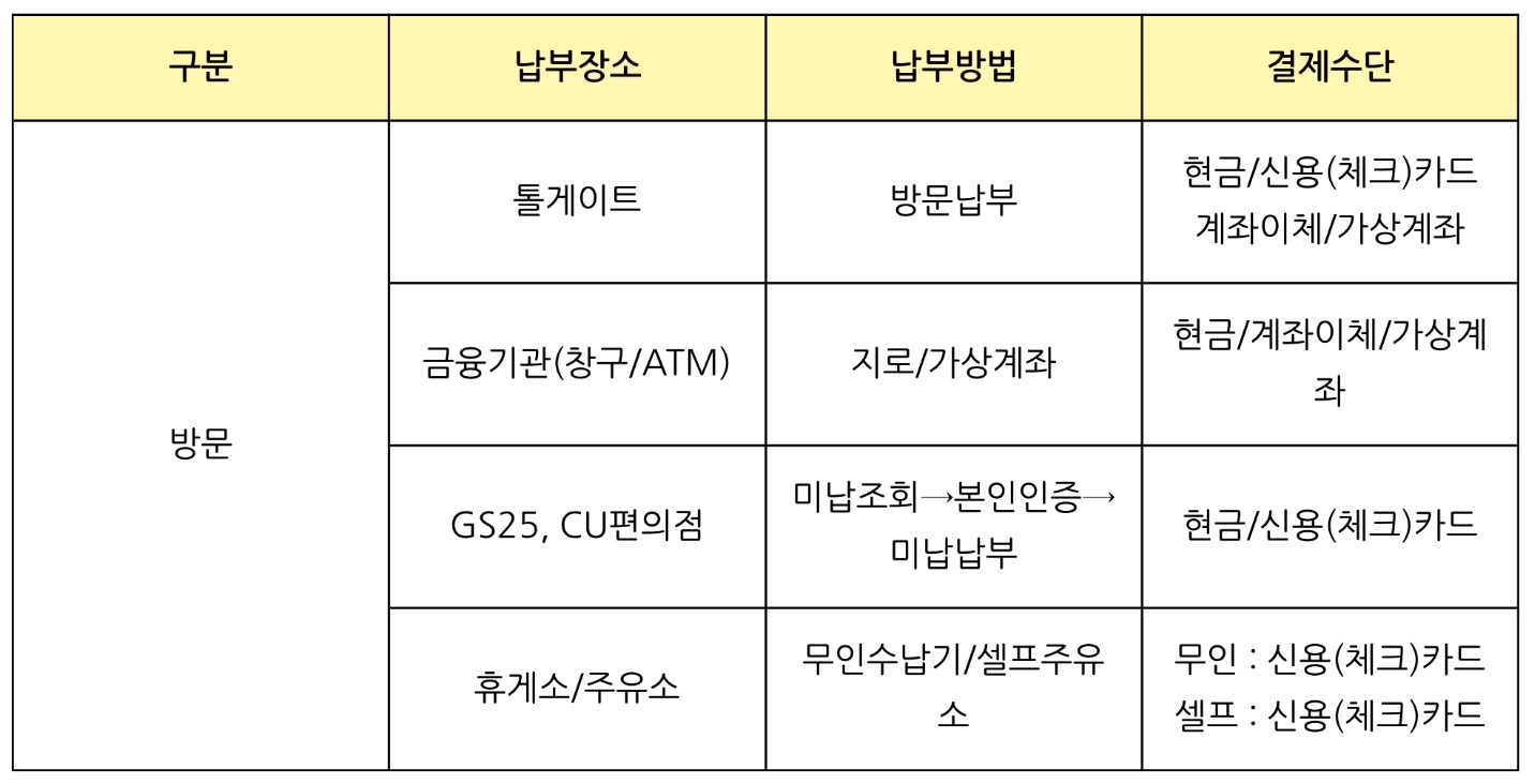 톨게이트 미납 요금 방문 납부가 어렵다면 고속도로 앱, 홈페이지 납부, 콜센터 등 다양한 방법으로 간편하게 지불이 가능합니다.