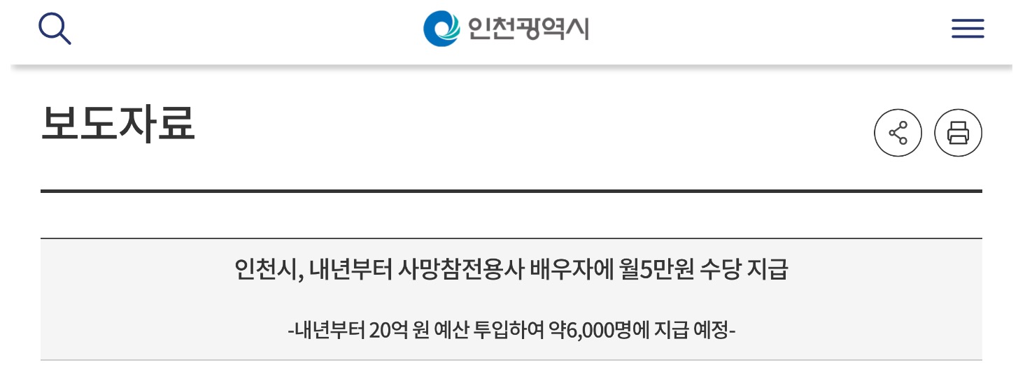 인천 사망참전용사 배우자 수당 지급대상은 인천시에 주민등록을 두고 거주하는 65세 이상의 사망참전유공자의 배우자로 내년 2024년 1월부터 월 5만 원(시비 2만5천 원, 군·구비 2만5천 원)씩을 지급할 계획이라고 합니다.