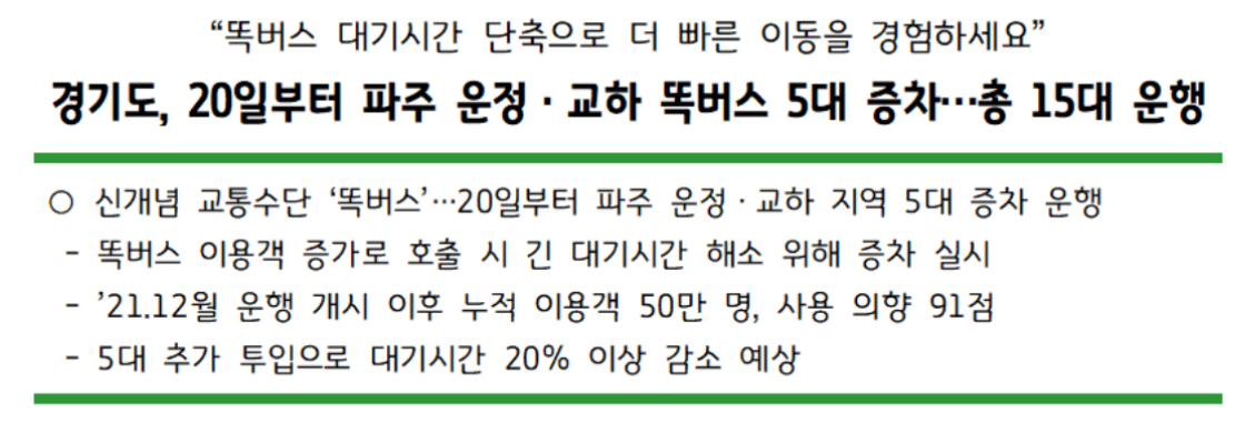 경기도는 운정‧교하 똑버스 5대 증차를 통해 현재 16.5분에 달하는 대기시간이 20% 이상 감소할 것으로 예상한다고 합니다.