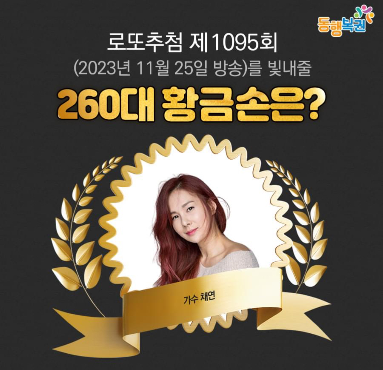 가수 채연이 1095회 MBC '생방송 행복드림 로또 6/45'의 '황금손'으로 출연한다고 합니다.