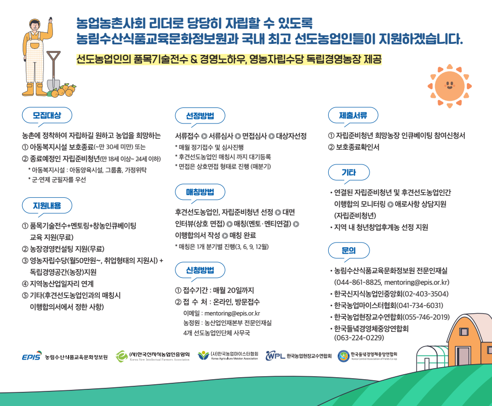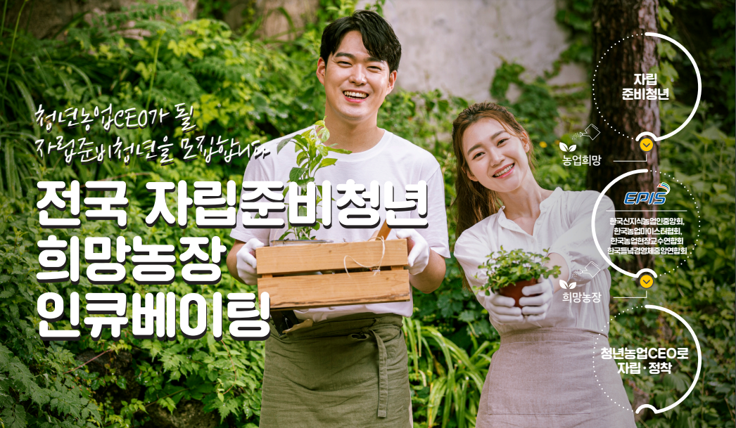 농림수산식품교육문화정보원(원장 이종순)은 신지식농업인회(회장 원용덕), 농업마이스터협회(회장 강창국), 현장교수연합회(회장 박현근), 들녘경영체중앙연합회(회장 장수용) 등 4개 선도농업인단체와 함께 자립준비청년의 농업·농촌 정착 지원을 위한 ‘희망농장 인큐베이팅’ 교육 참가자를 모집한다고 밝혔습니다.