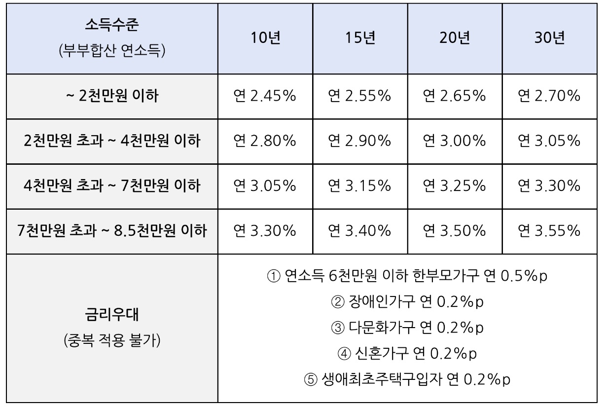 - 부부합산 연소득 6천만원 이하(생애최초 주택구입자, 2자녀 이상 가구 또는 신혼가구는 연소득 8.5천만원 이하)