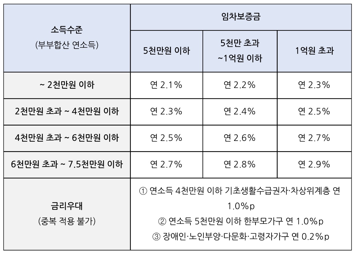 - 일반 2.5억원 이내(생애최초 주택구입자 3억원 이내), 신혼가구 및 2자녀 이상 가구 4억원 이내