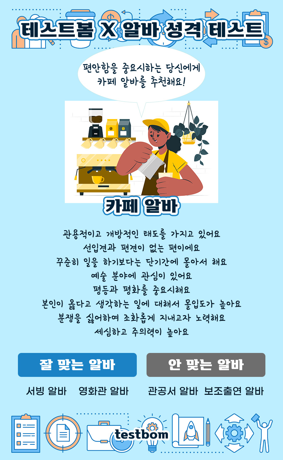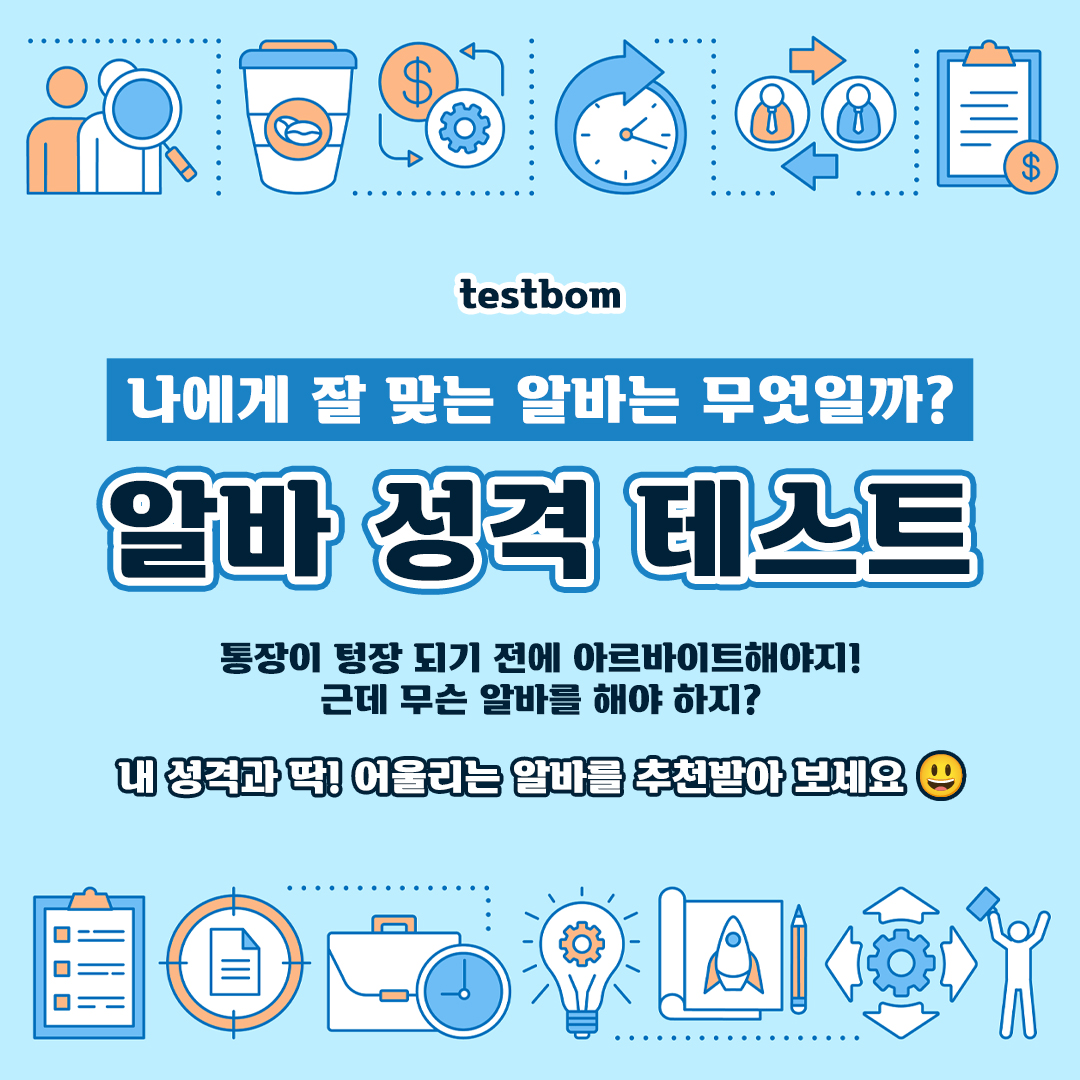 내 성격과 딱! 어울리는 알바를 추천받아 볼 수 있는 테스트봄의 알바 성격 테스트를 소개드리겠습니다.