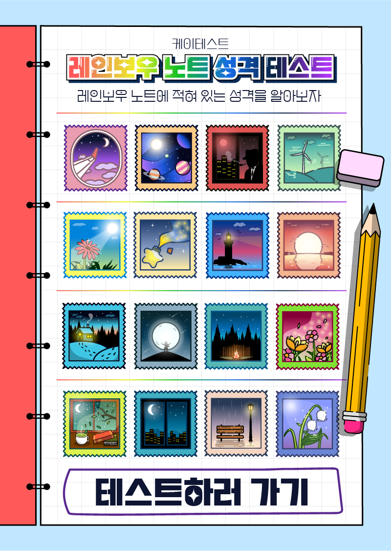 케이테스트에서 레인보우 노트에 적혀 있는 성격을 알아보는 ‘레인보우 노트 성격 테스트’가 나와서 소개드리려고 합니다.
