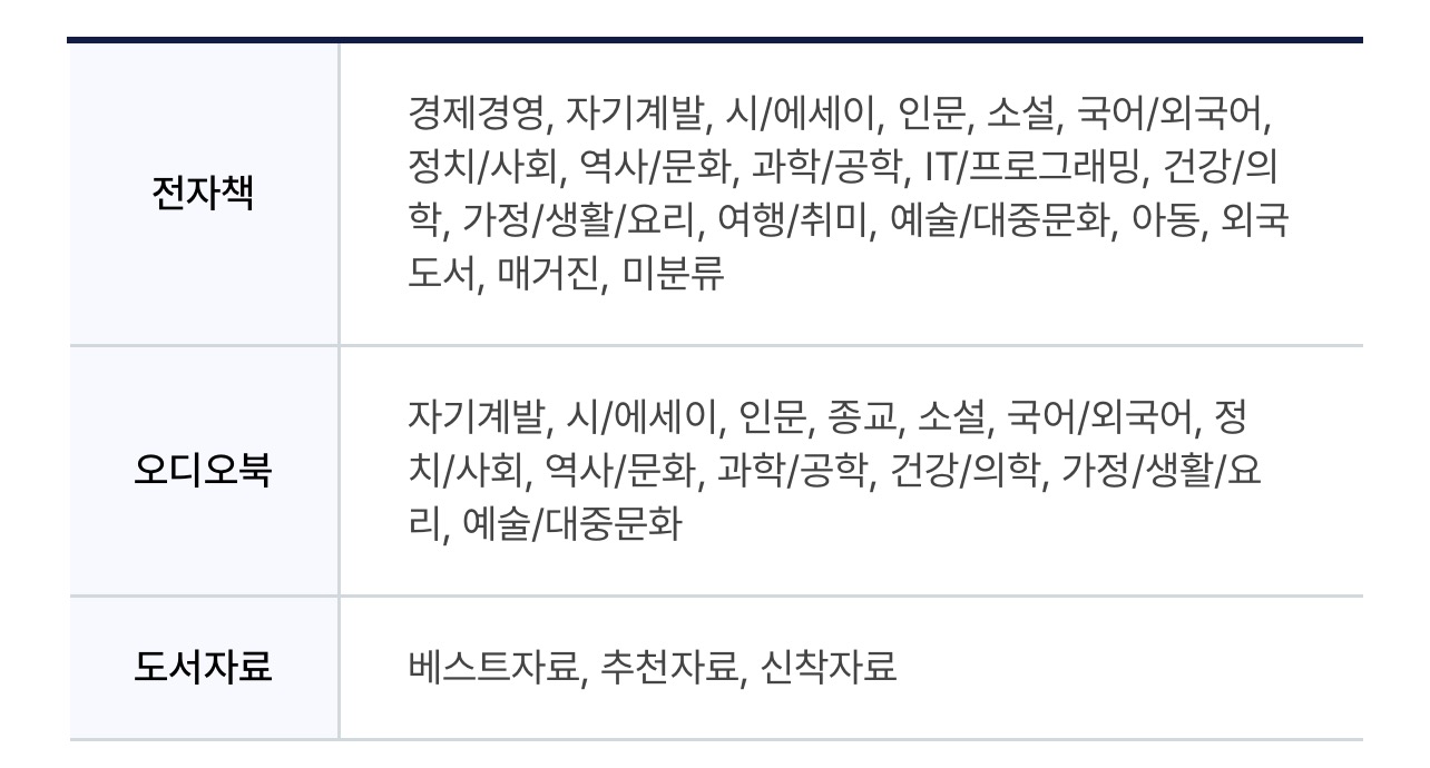 ➡️오디오북: 자기계발, 시/에세이, 인문, 종교, 소설, 국어/외국어, 정치/사회, 역사/문화, 과학/공학, 건강/의학, 가정/생활/요리, 예술/대중문화