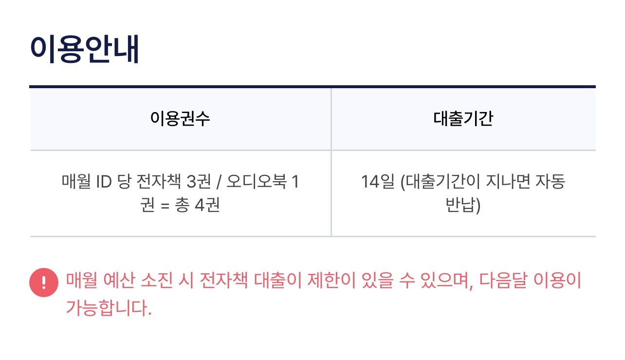 *매월 예산 소진 시 전자책 대출이 제한이 있을 수 있으며 다음달 이용이 가능