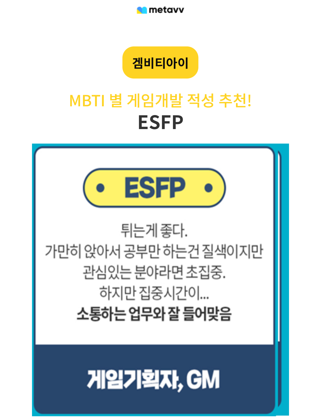 mbti로 게임개발 적성검사를 해볼 수 있는 게임 mbti 테스트인 겜비티아이 테스트가 있다고 하는데 여러분들께도 안내드리겠습니다.