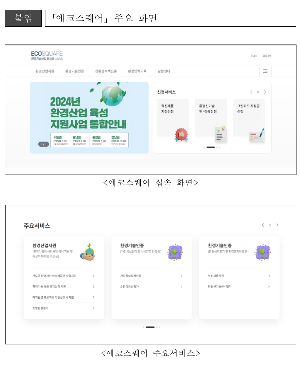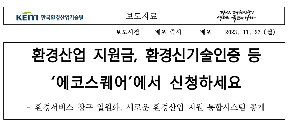 한국환경산업기술원(원장 최흥진)은 환경산업 지원금, 환경신기술 인증 등의 환경 분야 각종 신청 서비스를 통합하여 제공하는 ‘에코스퀘어’(www.ecosq.or.kr)를 2023년 11월 27일 공개했습니다.