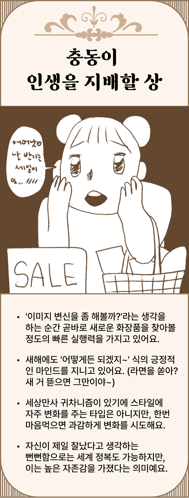 • '이미지 변신을 좀 해볼까?'라는 생각을 하는 순간 곧바로 새로운 화장품을 찾아볼 정도의 빠른 실행력을 가지고 있어요.