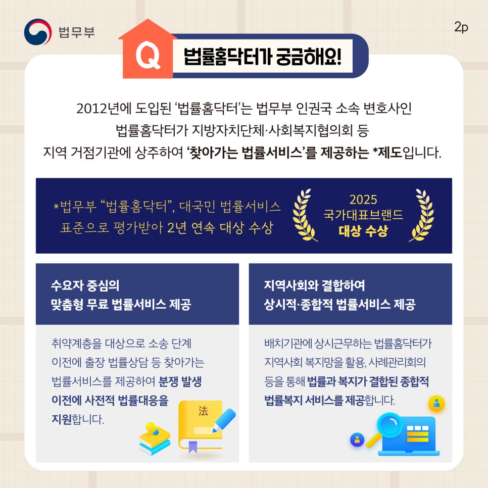법률홈닥터란 2012년에 도입된 '법률홈닥터'는 법무부 인권국 소속 변호사인 법률홈닥터가 지방자치단체 사회복지협의회 등 지역 거점기관에 상주하여 '찾아가는 법률서비스'를 제공하는 제도입니다.