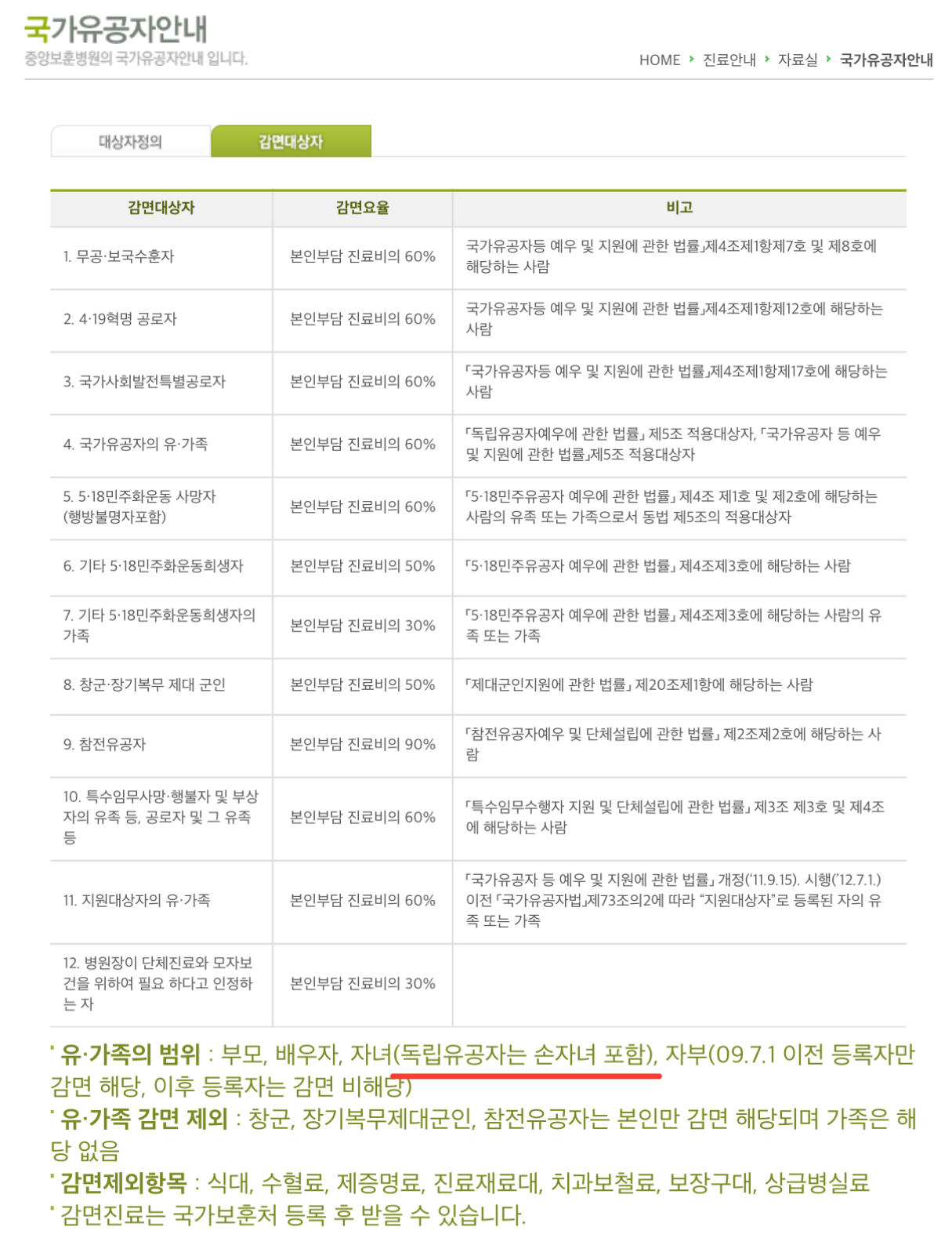 먼저 독립유공자 손자 후손도 보훈병원 진료비 감면대상입니다.