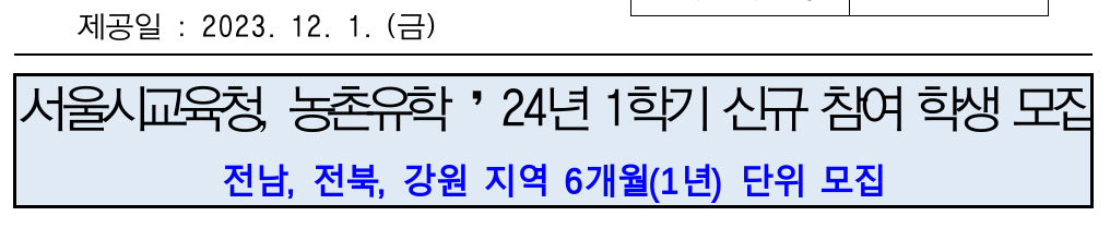 서울특별시교육청(교육감 조희연)은 2023년 12월 4일(월)부터 11일(월)까지 2024학년도 1학기 농촌유학 신규 참여 학생을 모집한다고 밝혔습니다.