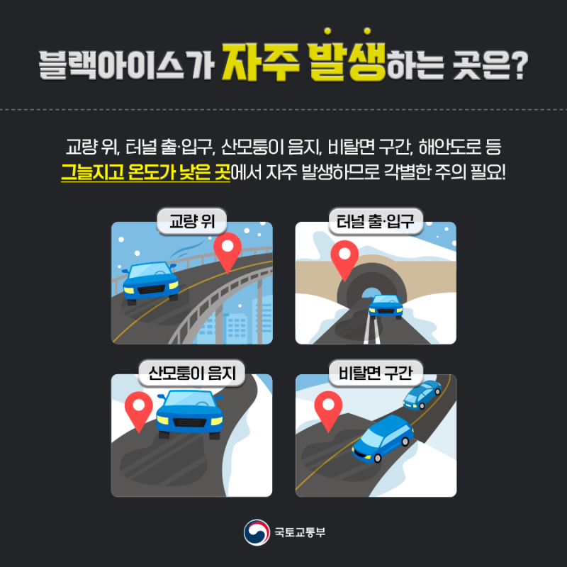 블랙아이스는 밑이 비어있는 교량이나 다리, 산 그늘이 도로를 덮은 곳, 터널의 출입구에 흔히 생깁니다.