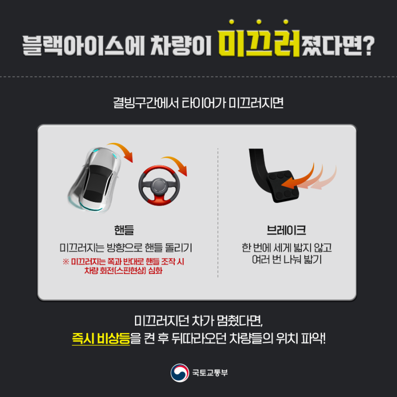 블랙아이스에 차량이 미끄러졌다면 다음과 같은 행동을 취하시길 바랍니다.