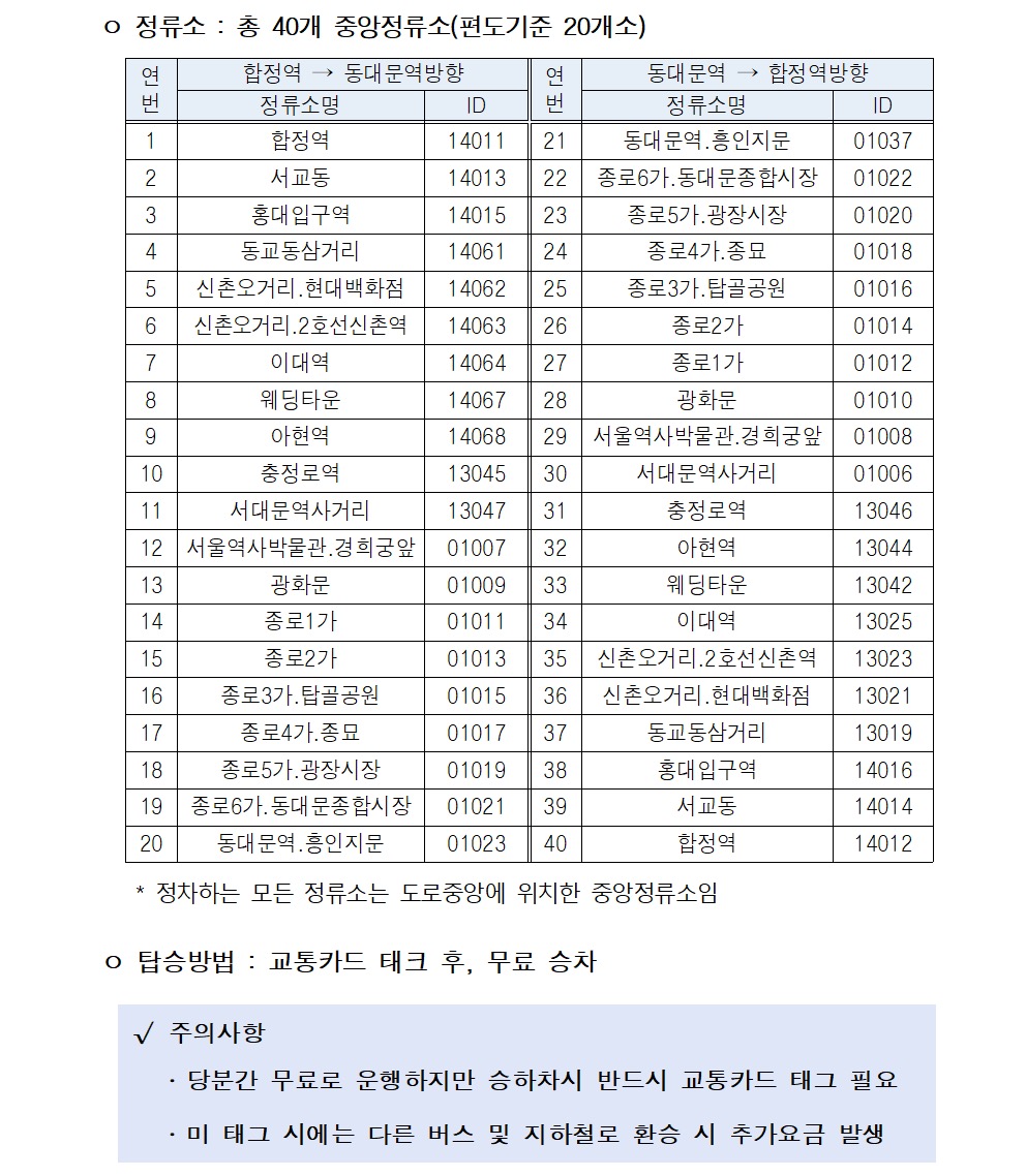 합정역~홍대입구역~신촌역~아현역~서대문역~세종로(교)~종로1가~종로5가~동대문역(흥인지문) 구간에서 일반 시내버스와 동일하게 도로중앙에 위치한 총 40개(편도기준 20개소) 중앙정류소에서 자유롭게 승하차가 가능합니다.