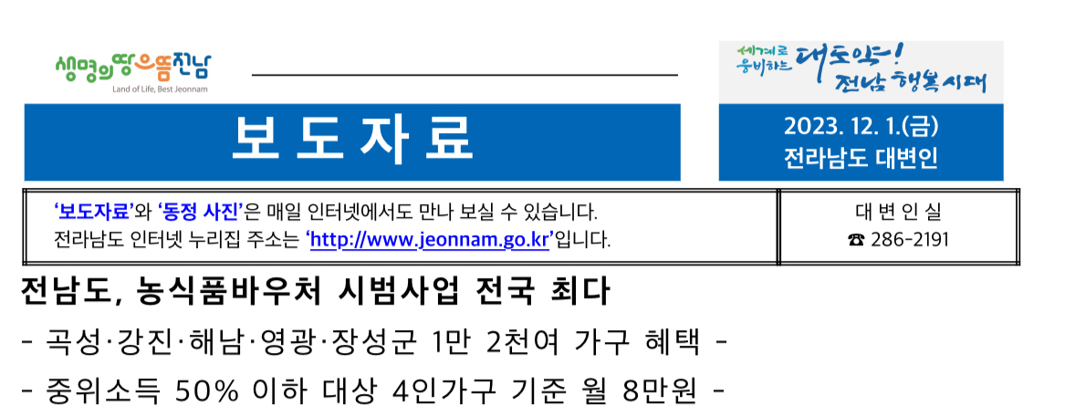총 35억 원(국비 18억 원·50%)이 투입되며 해당 지역의 중위소득 50% 이하인 기초생활수급자와 차상위계층 1만 2천 457가구에 6개월(3~8월) 간 월 8만 원(4인 가구 기준)의 농산물 구입권을 지원한다고 합니다.