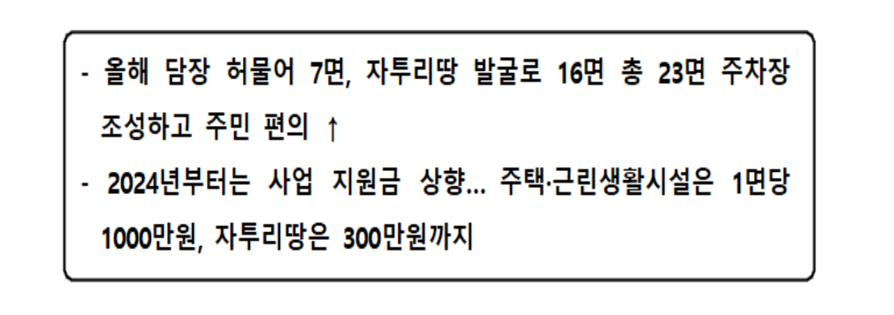 아울러 자투리땅 주차장을 조성하고 거주자우선주차구역으로 개방 시 1년 이상 토지 사용을 조건으로 주차장 운영 수익금을 받거나 재산세를 면제받을 수 있다고도 합니다.