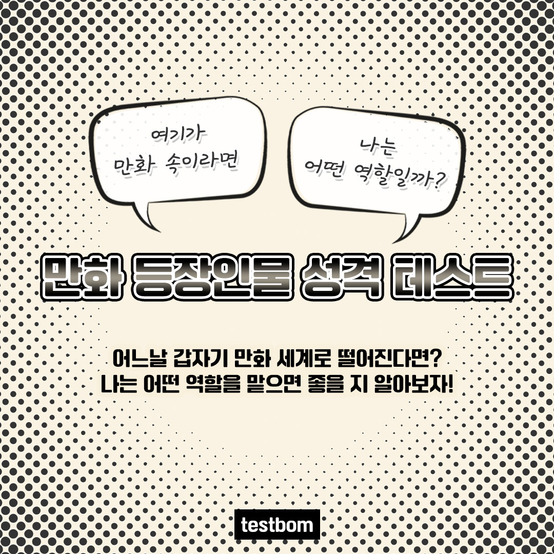 어느날 갑자기 만화 세계로 떨어진다면 나는 어떤 역할을 맡으면 좋을 지 알아보는 테스트봄에서 등장한 ‘만화 등장인물 성격 테스트’를 소개드리겠습니다.