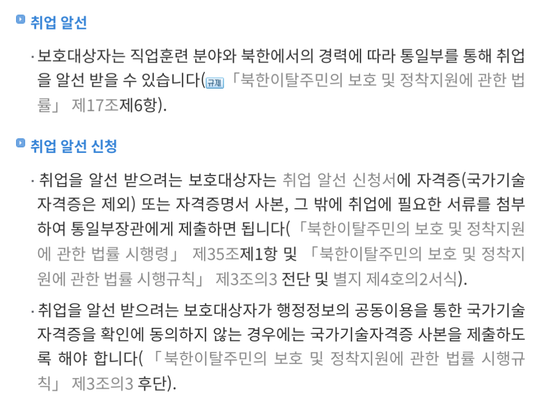 보호대상자는 직업훈련 분야와 북한에서의 경력에 따라 통일부를 통해 취업을 알선받을 수 있습니다(규제「북한이탈주민의 보호 및 정착지원에 관한 법률」 제17조 제6항).