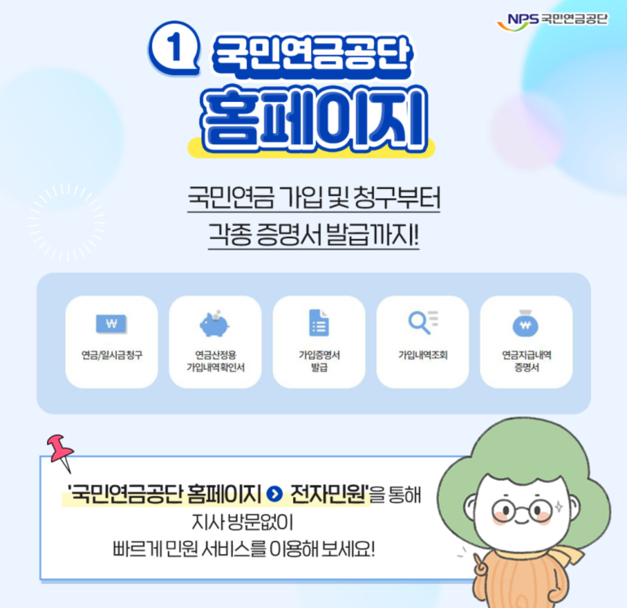 국민연금공단 홈페이지(https://www.nps.or.kr/)에서는 국민연금 가입 및 청구부터 각종 증명서 발급까지 ‘국민연금공단 홈페이지 > 전자민원’을 통해 지사 방문 없이 빠르게 민원 서비스를 이용해 보실수 있습니다.
