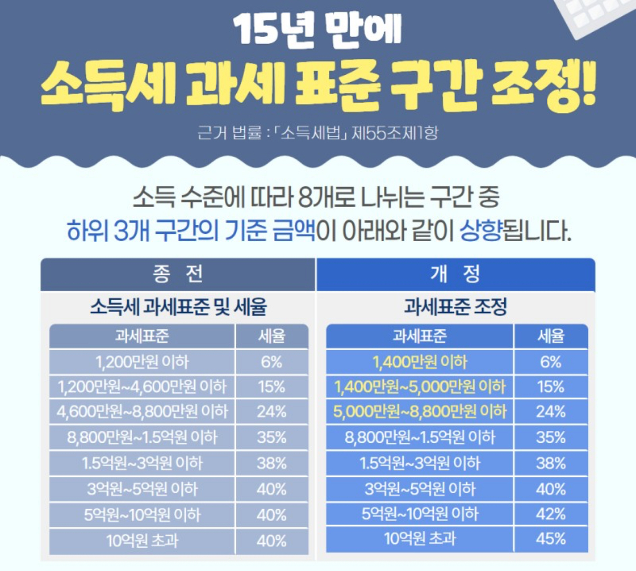 또한 「소득세법」 제55조 제1항에 따라 소득세 과세표준 구간이 조정된다고 합니다.