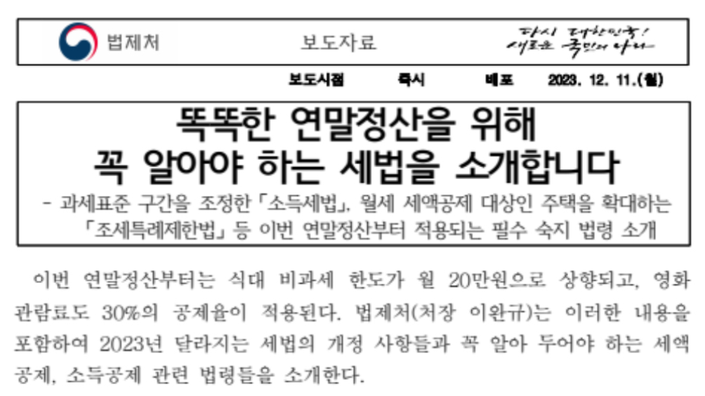 법제처(처장 이완규)는 이러한 내용을 포함하여 2023년 달라지는 세법의 개정 사항들과 꼭 알아 두어야 하는 세액공제, 소득공제 관련 법령들을 소개한다고 밝혔습니다.