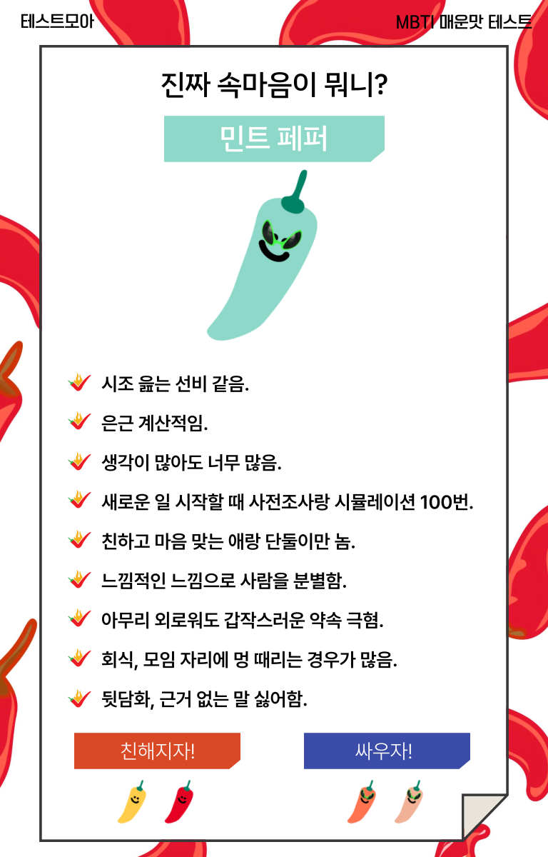 테스트모아에서 나의 매운맛 성격을 알아보는 MBTI 매운맛 테스트가 나왔는데 정말 재밌는 것 같아서 여러분들께 소개드리려고 합니다.