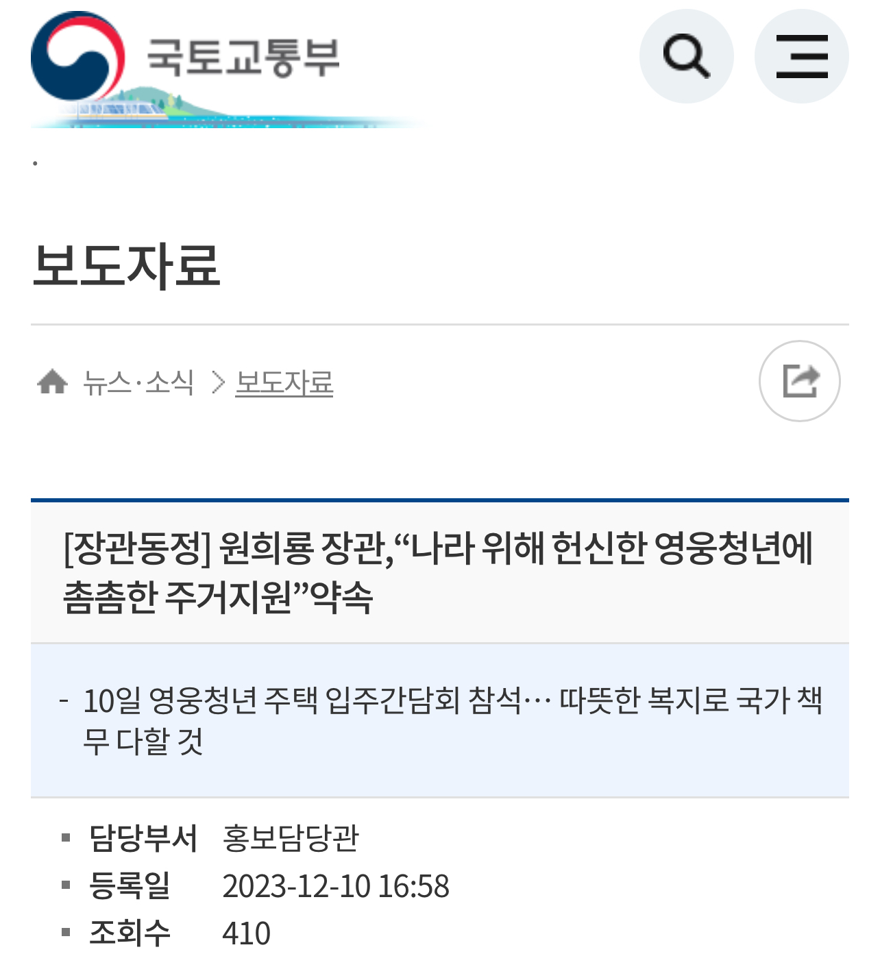 원희룡 국토교통부 장관은 2023년 12월 10일(일) 오후 3시 서울시 양천구에 위치한 특화형 매입임대주택(영웅청년 주택)*을 방문하여 입주 예정인 부상제대 군인 청년들을 직접 만나 국가에 헌신한 분들을 위한 촘촘한 주거지원을 약속했습니디.