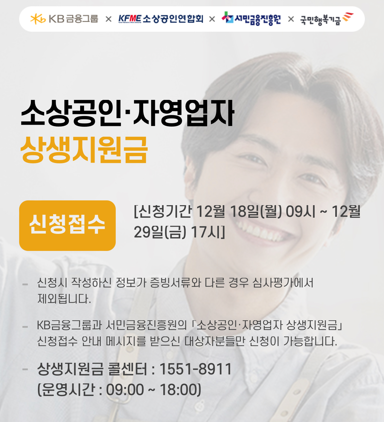 KB금융그룹 소상공인 자영업자 상생지원금 지원대상자는 서민금융대출을 이용하고 있거나 고금리 취약 차주로 분류되는 소상공인과 자영업자 중 ‘성실상환자’이며 KB국민은행과 서민금융진흥원이 카카오톡과 SMS(문자서비스)등을 통해 안내할 예정이라고 합니다.