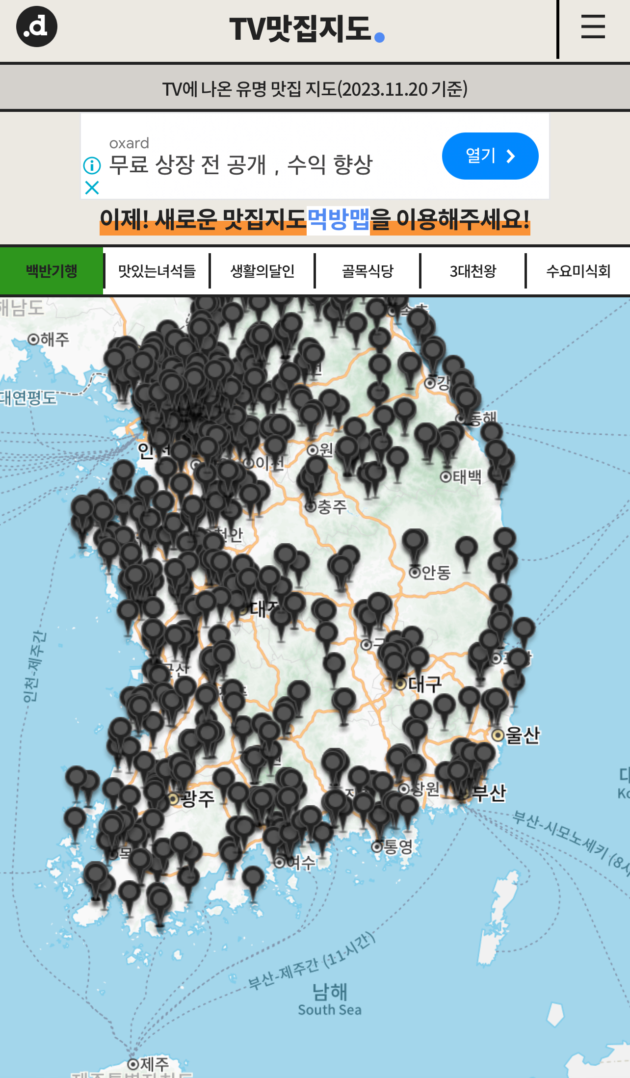 먼저 TV 맛집 지도 사이트를 접속하시면 위 사진과 같이 TV 맛집 리스트들을 볼 수 있습니다.