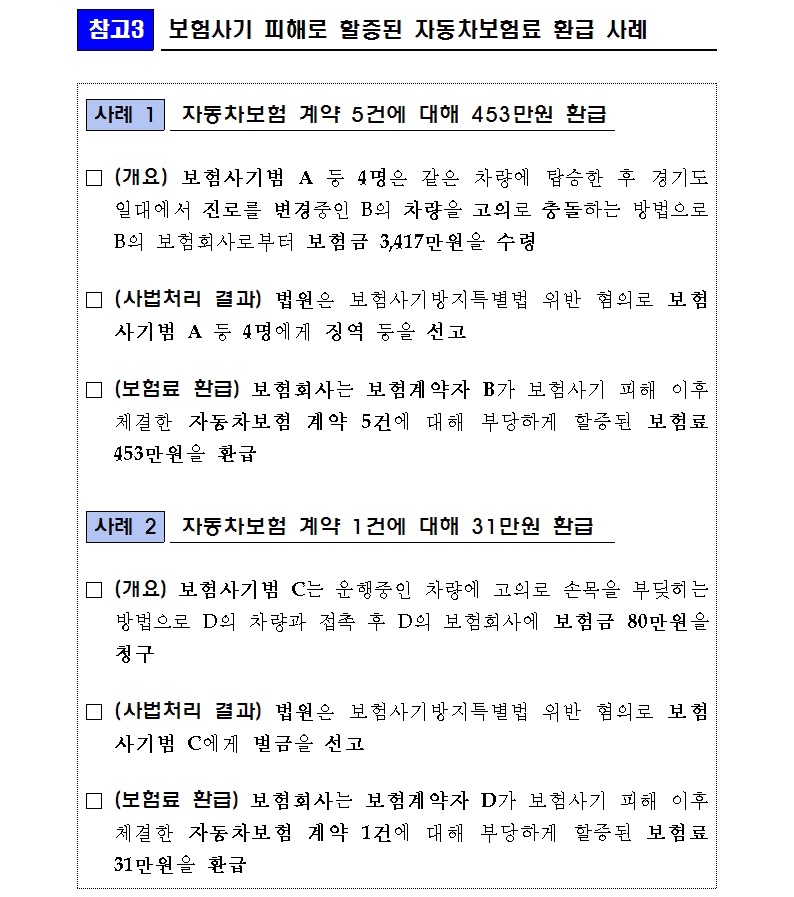 판결문을 통해 확인된 자동차 보험사기 유죄판결 확정 건(기소유예 포함)과 혐의자가 혐의를 인정한 건 중 가해자·피해자 간 공모가 없는 사고 등에 대해 할증된 보험료를 환급받을 수 있습니다.