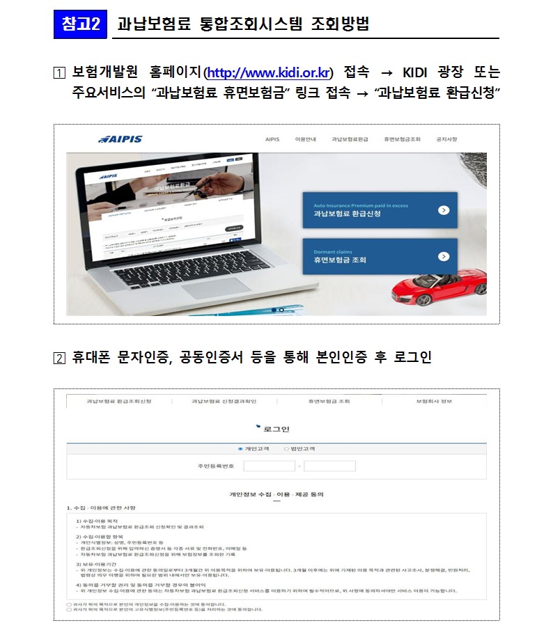 이와 관련해 보험개발원은 소비자가 보험사기 피해정보를 직접 확인하고 할증된 자동차보험료 환급을 신청할 수 있도록 '자동차보험 과납보험료 통합조회 서비스'를 운영하고 있습니다.