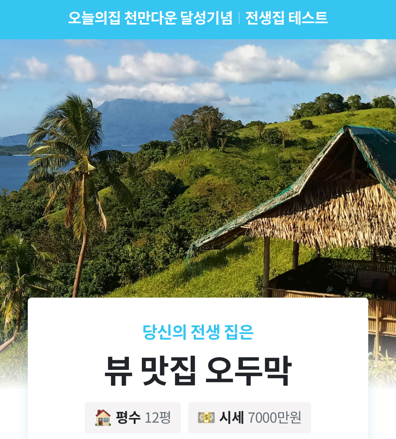 내가 전생에는 어떤 집에 살았을지 알려주는 오늘의집에서 나온 전생집 테스트가 있는데 움집, 기와집, 텐트 등 나의 전생 거주 공간은 대체 무엇이었을지 알아볼 수 있는데 결과로 나온 전생집에서 내가 집주인이었는지, 세입자였는지도 알려준다고 합니다.