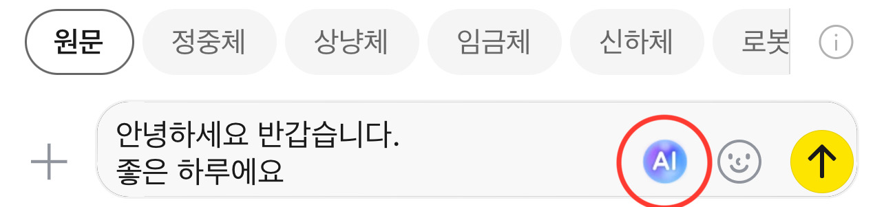 메시지 작성 후 대화창 하단에 AI 버튼을 클릭해 사용할 수 있습니다.