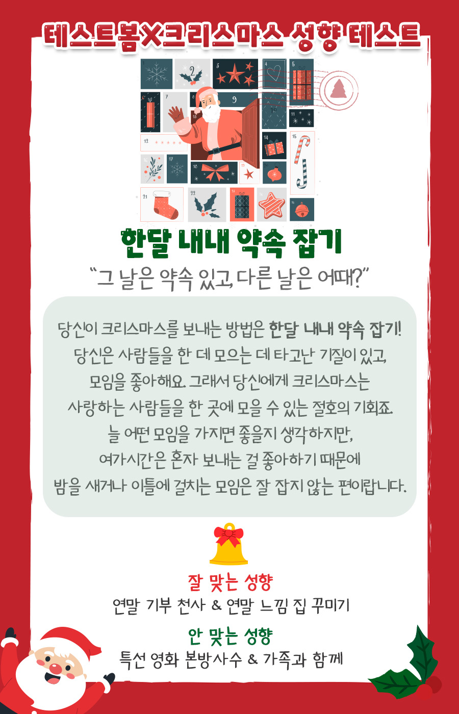 나는 이번 크리스마스에 뭘 하고 있을지 테스트봄에서 나온 크리스마스 성향 테스트를 소개드리겠습니다.