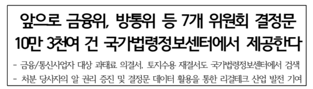 법제처(처장 이완규)와 행정안전부는 금융위원회, 방송통신위원회 등 7개 위원회가 보유하고 있는 결정문을 법제처 국가법령정보센터와 행정안전부 공공데이터포털 등을 통해 개방・제공한다고 밝혔습니다.