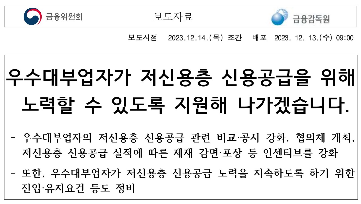 마지막으로 금융당국은 2024.1분기 중 서민금융 우수대부업자 제도개선과 관련한 감독규정 개정안 입법예고 등을 추진할 계획이라고 하며 또한, 서민금융 우수대부업자 등 대부업권이 저신용층 신용공급을 위한 역할을 보다 충실하게 수행할 수 있도록 금융회사·대부업권간 협의체 구성 등도 조속히 추진해 나갈 예정이라고 밝혔습니다.